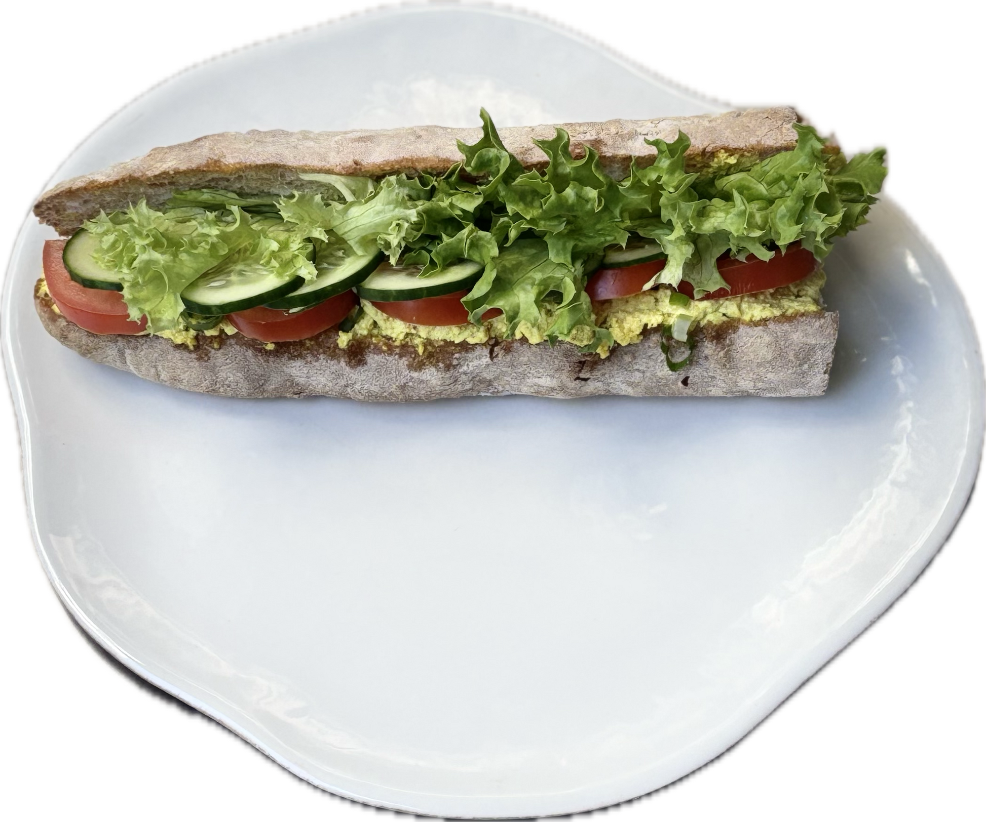 Składniki: pasta bezjajeczna na bazie tofu, zielona cebulka, ogórek, pomidor, sałata.