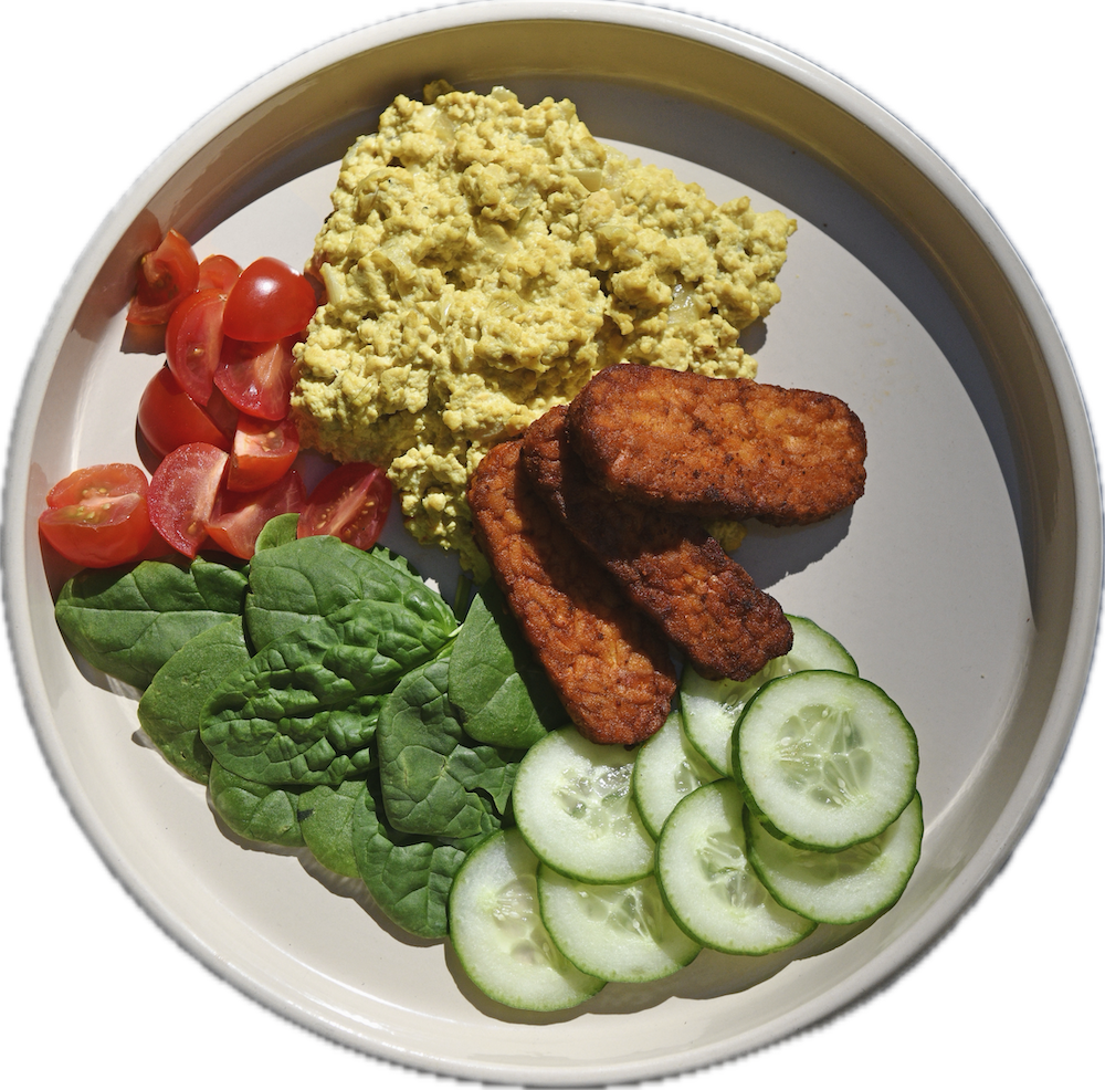 Tofucznicza podawana ze smażonym tempehem, pomidorami, ogórkiem, szpinakiem i chlebem na zakwasie