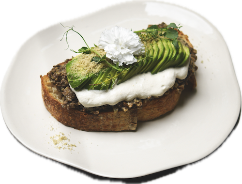 Pieczona brzoskwinia, serek z nerkowca, płatki migdałowe limonka & chili, awokado