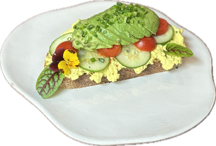 Pasta bezjajeczna na bazie tofu, zielona cebulka, ogórek, pomidor, sałata.