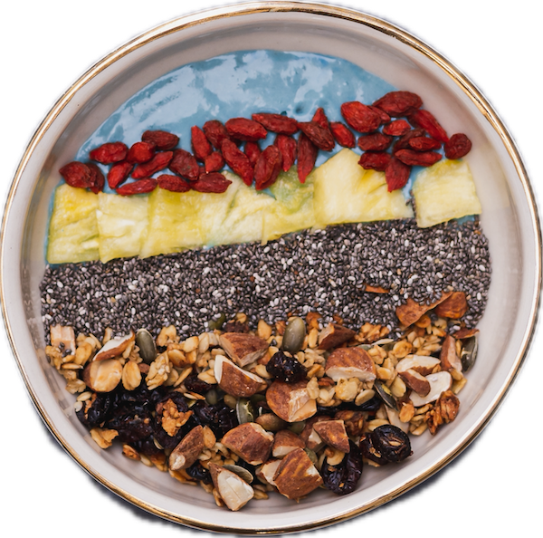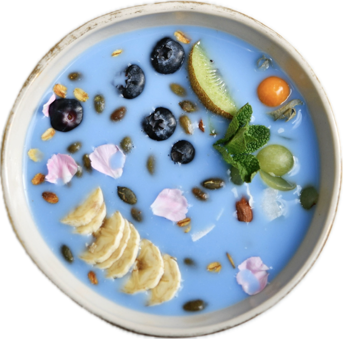 smoothie: banan, cytryna, niebieska spirulina, dodatki: cytrynowa granola, ananas, jagody goji, chia