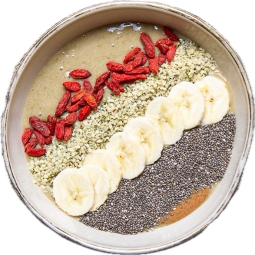 smoothie: banan, białko ryżowe i konopne, daktyle, dodatki: banany, masło migdałowe, nasiona konopii i chia, jagody goji